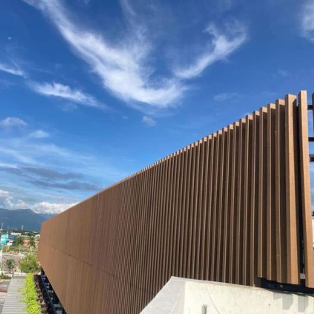Nowoczesne, kompozytowe zaokrąglone lamele na elewacji rewolucjonizują wygląd budynku, nadając mu fascynujące i oryginalne wykończenie.